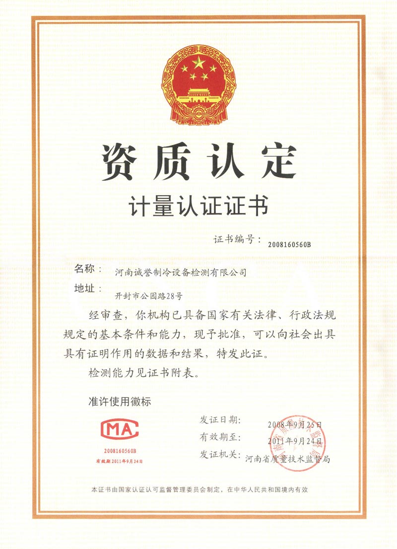 河南誠譽制冷設備檢測有限公司是1986年成立的省級制冷產(chǎn)品質(zhì)量檢驗測試機構(gòu)。1999年取得計量認證合格證,2008年再次通過計量認證評審。